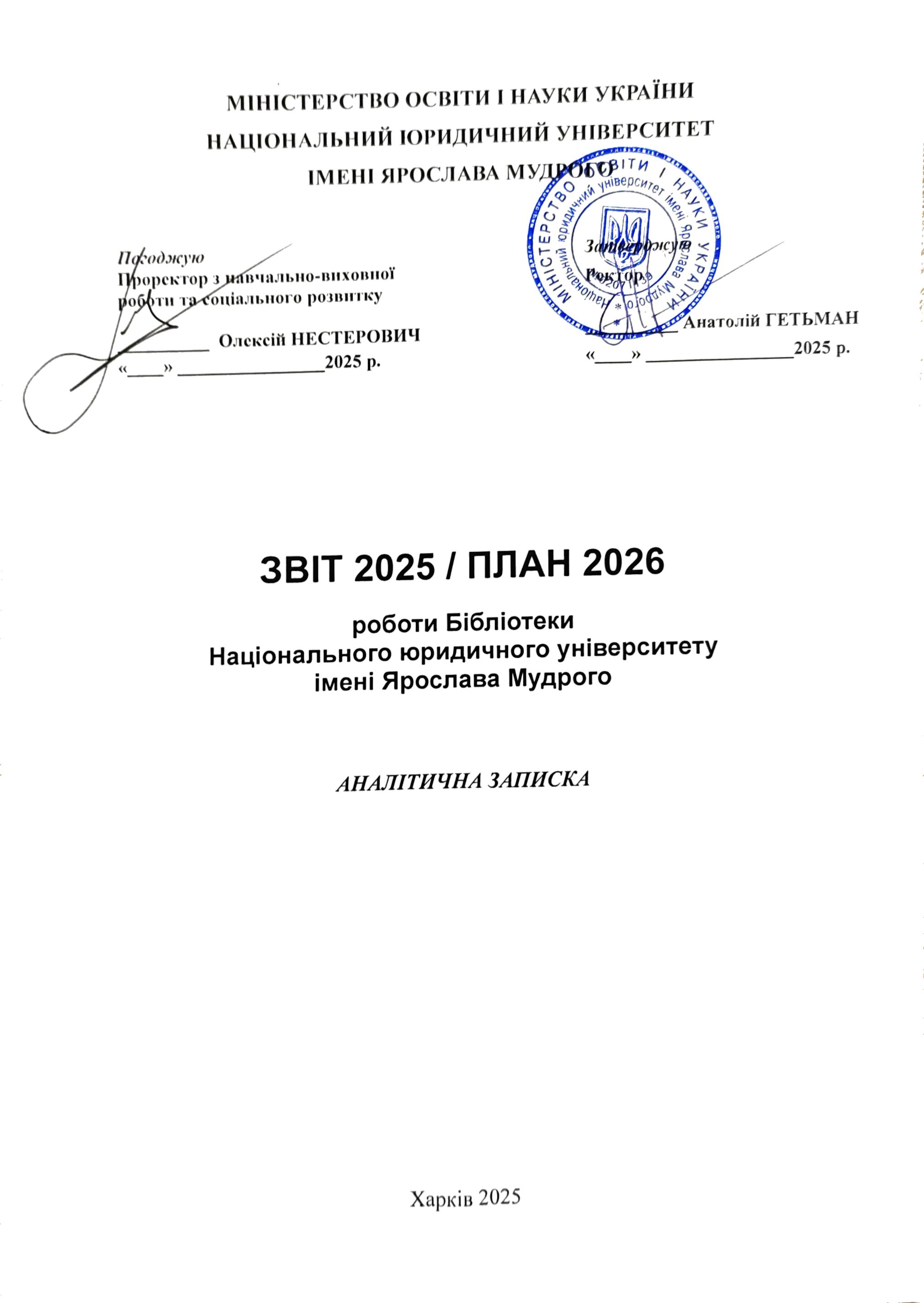 | Citation: | Звіт-план роботи Бібліотеки Національного юридичного університету імені Ярослава Мудрого. 2025-2026 рр. : аналітична записка / М-во освіти і науки України, Нац. юрид. ун-т ім. Ярослава Мудрого, Б-ка Нац. юрид. ун-ту ім. Ярослава Мудрого ; уклад. Н. П. Пасмор. – Харків, 2025. – 82 с. |